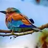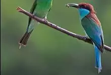 蓝喉蜂是蜂虎科蜂虎属鸟类。体长26-28厘米,嘴长而弯曲,有明显细长的中央尾羽。头部、颈部和背部为巧克力色,有黑色眼纹。喉部、腰部和尾羽为蓝色。腹部和两翼为绿色。幼鸟外观似成鸟,头部、颈部和背部为绿色,…全部>>