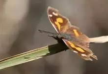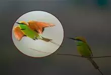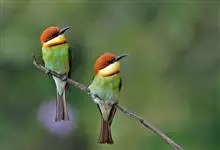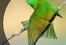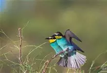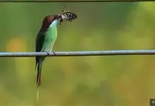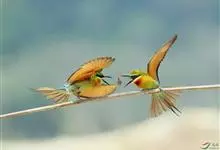 栗喉蜂虎是蜂虎科蜂虎属的鸟类。有热带鸟类羽毛艳丽的特征:喉部是栗红色的,黑色的过眼纹,翅膀和背部是绿色的,尾翼是蓝色的,飞行时翅膀下面的羽毛是橙黄色的,在阳光的照射下,它们全身闪烁着金属般的艳丽光泽,…全部>>