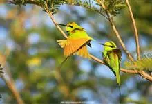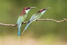 绿喉蜂虎是佛法僧目、蜂虎科的小型鸟类,共有9个亚种。身长22-25厘米,翼展29-30厘米,体重15-20克。喉绿色,额部、头顶至上背为锈红色,其余上体均为亮绿色。中央尾羽延长且端段狭细,…全部>>