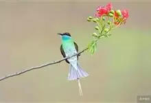 蓝喉蜂是蜂虎科蜂虎属鸟类。体长26-28厘米,嘴长而弯曲,有明显细长的中央尾羽。头部、颈部和背部为巧克力色,有黑色眼纹。喉部、腰部和尾羽为蓝色。腹部和两翼为绿色。幼鸟外观似成鸟,头部、颈部和背部为绿色,…全部>>