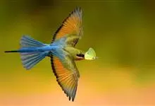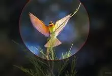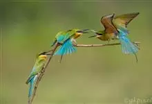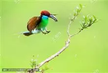 栗喉蜂虎是蜂虎科蜂虎属的鸟类。有热带鸟类羽毛艳丽的特征:喉部是栗红色的,黑色的过眼纹,翅膀和背部是绿色的,尾翼是蓝色的,飞行时翅膀下面的羽毛是橙黄色的,在阳光的照射下,它们全身闪烁着金属般的艳丽光泽,…全部>>