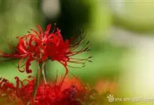 石蒜 Herb.):鳞茎近球形。秋季出叶,叶狭带状,顶端钝,深绿色,中间有粉绿色带;花茎高约30厘米;总苞片2枚,披针形;长约35厘米,宽约05厘米;伞形花序有花4-7朵;花鲜红色;花被裂片狭倒披针…全部>>