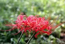 石蒜[学名:Lycoris radiata Herb.],是石蒜科石蒜属的多年生草本植物,别名彼岸花、红花石蒜、死人花、蟑螂花、龙爪花等。石蒜的叶狭带状,中间有粉绿色带,秋季出叶。伞形花序,花鲜红色。…全部>>