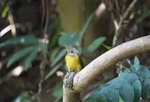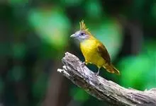 黄腹冠鹎:体长19-24厘米,是一种体型略大的褐色鹎。头顶橄榄褐色具黑褐色羽冠。白色的喉膨起,下体黄色。似白喉冠鹎但较鲜亮,上体褐色较重,腹部为鲜亮的柠檬黄色。虹膜褐色;嘴黑色;脚粉红色。…全部>>
