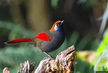 赤尾噪鹛中型鸟类,体长24~28厘米。头顶至后颈红棕色,两翅和尾鲜红色,眼先、眉纹、颊、颏和喉黑色,眼后有一灰色块斑。其余上下体羽大都暗灰或橄榄灰色。特征极明显,特别是通过鲜红色的头顶、翅和尾。…全部>>