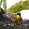 黄喉噪鹛体型略小,顶冠蓝灰色,特征为具黑色的眼罩和鲜黄色的喉。上体褐色,尾端黑色而具白色边缘,腹部及尾下覆羽皮黄色而渐变成白色。黄喉噪鹛隐匿于亚热带常绿林和浓密灌丛,于地面杂物中取食,喜食昆虫,…全部>>