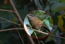 细纹噪鹛是画眉科、噪鹛属型鸟类,体长18-20厘米。上体暗橄榄灰色或暗棕褐色,头顶至后颈具细的黑色轴纹,背具细的白色羽干纹,腰至尾上覆羽橄榄灰色。下体棕褐色密被白色羽干纵纹。特征明显,容易识别。…全部>>