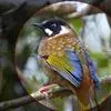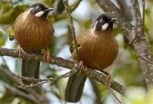 黑顶噪鹛:中型鸟类,体长24-26厘米。前额、脸、颏、喉黑色,头顶黑褐沾棕或深棕橄榄褐色,背栗褐或棕褐色,颧斑白色或棕红色,眼后缘和颈侧亦具白斑,飞羽金黄橄榄色而具蓝灰色尖端。下体淡棕褐色。…全部>>