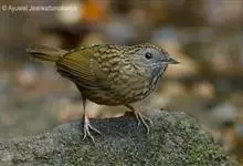 黄喉雀鹛是雀眉科、拟希鹛属小型鸟类,体长11-12厘米。头顶浅黄色具黑色鳞状斑,头顶两侧各有一道黑色侧冠纹,眉纹浅黄色、长而宽阔。上体灰绿色,两翅和尾褐色而具浅黄色窄缘。下体淡黄色。特征明显,…全部>>
