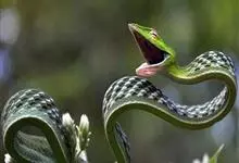 绿瘦蛇是游蛇科,瘦蛇属轻毒性后沟牙毒蛇。体型极细而长,长可达1.5米。头较窄长,与颈区分极明显;吻端略圆而平扁,超出下领;眼大,瞳孔呈一横缝;颊区呈一凹槽;躯干瘦长侧扁,尾甚长而细。背面鲜绿色,…全部>>