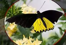 金裳凤蝶是凤蝶科、裳凤蝶属的动物。金裳凤蝶身体呈黑色,头、颈和胸侧有红毛,腹部有黑黄两色相间条纹,雄蝶前翅黑色,具黑天鹅绒光泽,各脉两侧灰白色,后翅金黄色,各室外缘有等腰三角形黑斑1枚,斑内侧有晕,…全部>>