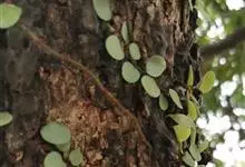 伏石蕨是水龙骨科、伏石蕨属小型附生蕨类植物。根状茎细长横走,淡绿色,疏生鳞片粗筛孔,两侧不规则分叉。叶远生,二型;叶片近球圆形或卵圆形,基部圆形或阔楔形,全缘;能育叶狭缩成舌状或狭披针形,叶脉网状,…全部>>
