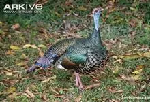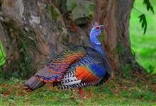 眼斑吐绶鸡:是火鸡科的两种鸟类之一。体型比普通火鸡略小些,体长1米左右,体重2.4-5.4千克,雄性比雌性略大,长得很特别,蓝色的秃脑袋上冒出几个橙黄色的疙瘩。但是它羽色艳丽,身体呈铜色及绿色。…全部>>
