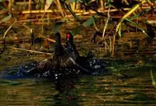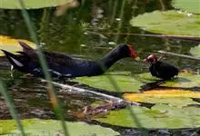 黑水鸡:是鹤形目、秧鸡科的鸟类,共有12个亚种。中型涉禽,体长24-35厘米。嘴长度适中,鼻孔狭长;头具额甲,后缘圆钝;嘴和额甲色彩鲜艳。翅圆形,第2枚初级飞羽最长,或第2枚和第3枚初级飞羽等长,…全部>>