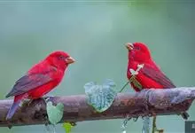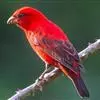 血雀雀科朱雀属鸟类,体重36-49克;体长155-182毫米。雄鸟除眼先、翼与尾为黑色外,通体为鲜红色;嘴鲜黄;雌鸟暗橄榄绿色,羽端较淡或带黄色;腰鲜黄;嘴较暗。虹膜褐色;嘴黄色;腿和脚褐色。…全部>>