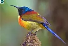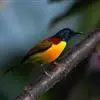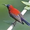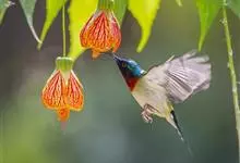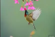 黑胸太阳鸟:小型鸟类,体长9-15厘米。嘴细长而向下曲。雄鸟中央尾羽特长,尾呈楔形,头顶至后颈紫蓝色具金属光泽;背褐红色,腰有一黄色横带,尾上覆羽和尾紫蓝色;颏、喉和上胸乌黑色,有的下胸为硫黄色,…全部>>