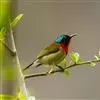 绿喉太阳鸟:共有9个亚种。小型鸟类,雄鸟体长13-15厘米、雌鸟10-12厘米。雄鸟前额至后颈、颏和喉辉绿色,头侧黑色,颈侧和背暗红色,两肩、下背橄榄绿色,腰鲜黄色,尾上覆羽和中央尾羽暗绿色,…全部>>