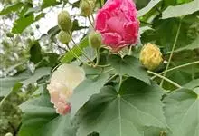木芙蓉,锦葵科木槿属落叶灌木或小乔木。小枝上有细绒毛;叶片为卵状心形,托叶为披针形,常早落;花单生,花萼为钟形,花冠初为白色或淡红色,后逐渐变为深红色;果实为扁球形,有淡黄色的毛附着。花期8到10月。…全部>>
