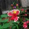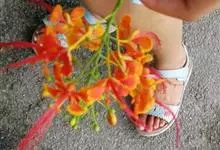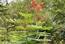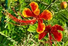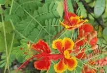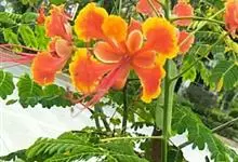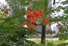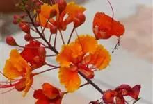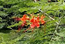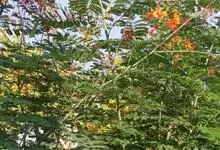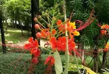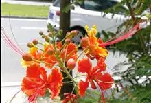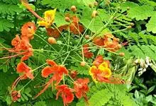 洋金凤 Sw.),豆科小凤花属灌木状或小乔木植物,枝无毛,绿或粉绿色;二回羽状复叶;总状花序伞房状,萼片无毛,花瓣橙红或黄色,圆形,花丝红色,子房无毛,花柱橙黄色;荚果窄而薄,…全部>>