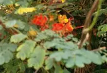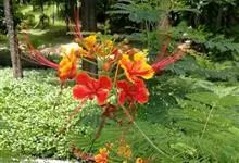 洋金凤 Sw.),豆科小凤花属灌木状或小乔木植物,枝无毛,绿或粉绿色;二回羽状复叶;总状花序伞房状,萼片无毛,花瓣橙红或黄色,圆形,花丝红色,子房无毛,花柱橙黄色;荚果窄而薄,…全部>>