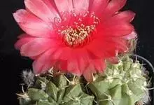 绯花玉 Speg.)是仙人掌科、裸萼球属多肉植物,植株呈扁球形,表皮墨绿色,刺针状,每个刺座有5枚灰色周刺,花生于球体顶端,夏季开花,花色有白、粉红、深红等。果实纺锤形,深灰绿色,种子黑色。…全部>>