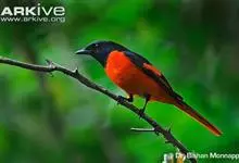 灰喉山椒鸟:共有8个亚种。体长18-22厘米。雄鸟头部和背亮黑色,腰、尾上覆羽和下体朱红色,翅黑色具一大一小的两道朱红色翼斑。中央尾羽黑色,外侧尾羽基部黑色,端部红色。…全部>>