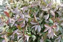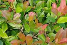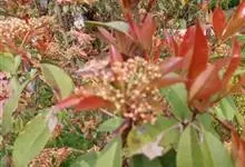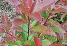 红叶石楠 是蔷薇科,石楠属杂交种,为常绿小乔木或灌木,乔木高可达5米、灌木高可达2米。叶片革质,长圆形至倒卵状、披针形,叶端渐尖,叶基楔形,叶缘有带腺的锯齿,花多而密,复伞房花序,花白色,梨果黄红色,…全部>>