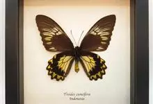 亚历山大女皇鸟翼凤蝶,又称大鸟翼蝶,是鳞翅目凤蝶科鸟翼蝶属蝴蝶;翅膀圆阔、褐色,雌性翅膀上会点缀着耀眼的白色斑纹;雄性翅膀上则闪耀着红蓝色的光泽。亚历山大女皇鸟翼凤蝶幼时很黑,身上长有红色的结节,…全部>>