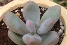 星美人是景天科、厚叶莲属多年生多浆肉质草本植物。植株具直立的短茎。叶12-20片互生,排列呈延长的莲座状,肉质,倒卵形,长2-4厘米,宽2-2.5厘米,厚2厘米,先端平滑钝圆,…全部>>