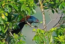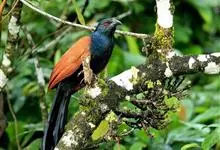 褐翅鸦鹃,是鹃形目鸦鹃科鸦鹃属的鸟类。褐翅鸦鹃的身体为黑色;头颈和胸带蓝紫色金属光泽并具黑亮的羽干纹,下胸至腹部泛金属绿光泽;两翼和肩部为棕栗色,外侧飞羽具暗色羽端,尾羽闪铜绿色光泽;虹膜赤红色,…全部>>