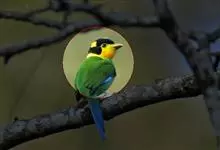 绿胸八色鸫:是雀形目八色鸫科的鸟类,共有12个亚种。体长为16-18厘米,体重65-69克。体型圆胖,尾短,腿长。头黑,上体绿色,两翼深色而具白色斑纹,头顶至后枕深褐,胸及腹部苹果绿,臀亮红。…全部>>