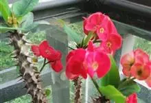 虎刺梅:别称铁海棠,是蔓生灌木植物。茎多分枝,长60-100厘米,直径5-10毫米,具纵棱,密生硬而尖的锥状刺,刺长1-1.5厘米,直径0.5-1.0 毫米,常呈3-5列排列于棱脊上,呈旋转。叶互生…全部>>