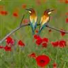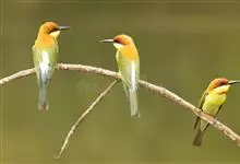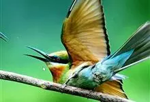 栗喉蜂虎是蜂虎科蜂虎属的鸟类。有热带鸟类羽毛艳丽的特征:喉部是栗红色的,黑色的过眼纹,翅膀和背部是绿色的,尾翼是蓝色的,飞行时翅膀下面的羽毛是橙黄色的,在阳光的照射下,它们全身闪烁着金属般的艳丽光泽,…全部>>
