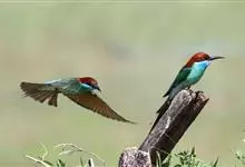 绿喉蜂虎是佛法僧目、蜂虎科的小型鸟类,共有9个亚种。身长22-25厘米,翼展29-30厘米,体重15-20克。喉绿色,额部、头顶至上背为锈红色,其余上体均为亮绿色。中央尾羽延长且端段狭细,…全部>>
