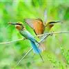 蓝颊蜂虎:是蜂虎科、蜂虎属的鸟类,共有2个亚种。体长27-33厘米,翼展46-49厘米,体重38-50克。嘴形细长而下弯,先端尖,…全部>>