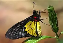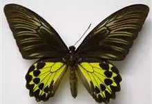 金裳凤蝶是凤蝶科、裳凤蝶属的动物。金裳凤蝶身体呈黑色,头、颈和胸侧有红毛,腹部有黑黄两色相间条纹,雄蝶前翅黑色,具黑天鹅绒光泽,各脉两侧灰白色,后翅金黄色,各室外缘有等腰三角形黑斑1枚,斑内侧有晕,…全部>>