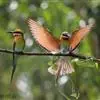栗喉蜂虎是蜂虎科蜂虎属的鸟类。有热带鸟类羽毛艳丽的特征:喉部是栗红色的,黑色的过眼纹,翅膀和背部是绿色的,尾翼是蓝色的,飞行时翅膀下面的羽毛是橙黄色的,在阳光的照射下,它们全身闪烁着金属般的艳丽光泽,…全部>>