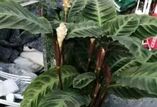 绒叶肖竹芋 Lindl.)是竹芋科,肖竹芋属多年生中等大草本植物,株高可达1米。叶片长圆状披针形,不等侧,叶面深绿,有黄绿色的条纹,天鹅绒般,叶背幼时浅灰绿色,老时淡紫红色,头状花序,花冠紫堇色或白色,…全部>>