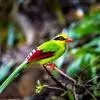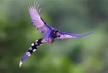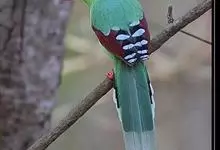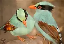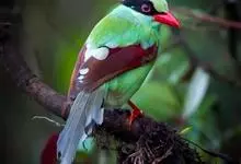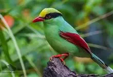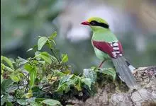 蓝绿鹊:中型鸟类,共有5个亚种。体长36-38厘米。尾长,嘴、脚红色。通体羽色主要为草绿色,宽阔的黑色贯眼纹向后延伸到后颈,在绿色的头侧极为醒目。两翅栗红色,内侧飞羽具黑色次端斑和白色尖端。尾绿色,…全部>>