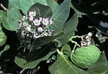 牛角瓜 W. T. Aiton)是夹竹桃科、牛角瓜属直立灌木,高达3米,全株具乳汁;茎黄白色,枝粗壮,幼枝部分被灰白色绒毛。叶倒卵状长圆形或椭圆状长圆形,长8-20厘米,宽3.5-9.5厘米。…全部>>