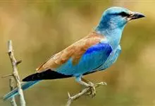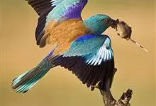 棕胸佛法僧是佛法僧科佛法僧属中型鸟类,体长32~35厘米。黑色的嘴细而下弯。头顶暗蓝色,喉、上背及部分飞羽淡紫;上胸葡萄紫色,具蓝色中央纹,下胸葡萄褐色,腹和尾下覆羽淡蓝色。腰蓝紫色,尾上覆羽辉蓝色。…全部>>