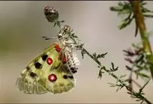 阿波罗绢蝶:翅展约7-8.4厘米。前翅较圆,白垩色,翅表有许多黑点、灰白斑及无鳞透明区,这些斑点的形状、密度及其强度常随产地的不同而有所变化,但后翅通常总有显著的鲜红色斑点。触角主干灰白色,…全部>>
