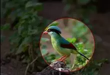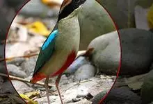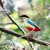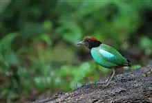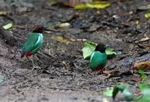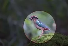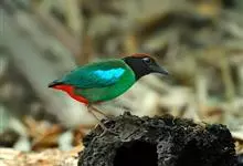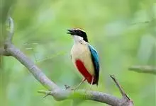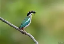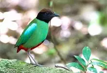 绿胸八色鸫:是雀形目八色鸫科的鸟类,共有12个亚种。体长为16-18厘米,体重65-69克。体型圆胖,尾短,腿长。头黑,上体绿色,两翼深色而具白色斑纹,头顶至后枕深褐,胸及腹部苹果绿,臀亮红。…全部>>