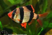 虎皮鱼又名四间鱼、品品鱼等。隶属鲤形目鲤科,热带淡水鱼类。其体高,侧扁略呈卵圆形。体呈浅黄色,背部为金黄色,背鳍、腹鳍、尾鳍和吻部均为鲜红。鱼体上有四条黑色粗带状竖纹,第一条竖纹通过眼部,…全部>>