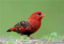 红梅花雀小型鸟类,体长9-10厘米。雄鸟通体朱红色,背、肩、胸等满布白色小斑点,两翅和尾黑褐色均具白色端斑,嘴红色,脚蜡黄色。雌鸟上体淡褐色或赭褐色,翅上中覆羽、大覆羽和内侧飞羽末端具白色斑点,…全部>>
