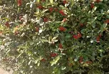 火棘 H. L. Li)是蔷薇科火棘属常绿灌木,老枝呈暗褐色;叶片呈倒卵形,边缘有钝锯齿,齿尖向内弯,两面皆无毛;叶柄短,无毛或嫩时有柔毛;花序是复伞房状,花瓣呈白色近圆形;果球近圆形,…全部>>