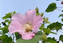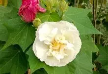 木芙蓉,锦葵科木槿属落叶灌木或小乔木。小枝上有细绒毛;叶片为卵状心形,托叶为披针形,常早落;花单生,花萼为钟形,花冠初为白色或淡红色,后逐渐变为深红色;果实为扁球形,有淡黄色的毛附着。花期8到10月。…全部>>