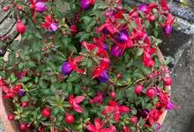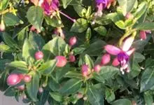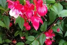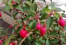 倒挂金钟是柳叶菜科倒挂金钟属亚灌木植物。茎直立,多分枝;幼枝带红色,被短柔毛与腺毛,老时渐无毛;叶对生,卵形或窄卵形,脉常带红色;常带红色,被短柔毛与腺毛;花筒红色,筒状钟形,…全部>>