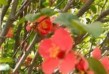 贴梗海棠Nakai)是蔷薇科、木瓜海棠属植物。落叶灌木,高达2米,枝条直立开展,有刺。叶片卵形至椭圆形,稀长椭圆形,长3-9厘米,宽1.5-5厘米。花先叶开放,3-5朵簇生于二年生老枝上。…全部>>