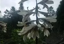 大百合 Makino)是百合科大百合属的多年生草本植物。小鳞茎卵形;叶纸质,网状脉,基生叶卵状心形或宽,茎生叶卵状心形;总状花序,花狭喇叭形,内具淡紫红色条纹,花丝向下渐扩大,子房圆柱形;蒴果近球形,…全部>>